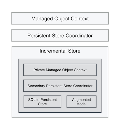 Modifying our basic incremental store to include a secondary PSC requires a bit of work, most related to setting up the Core Data stack. Let’s go over some of the key changes. To begin with, we’ll need to modify our Incremental Store to include a private Core Data stack, which will be used to return results immediately, when possible. Here is how the Augmented Managed Object Model is defined.